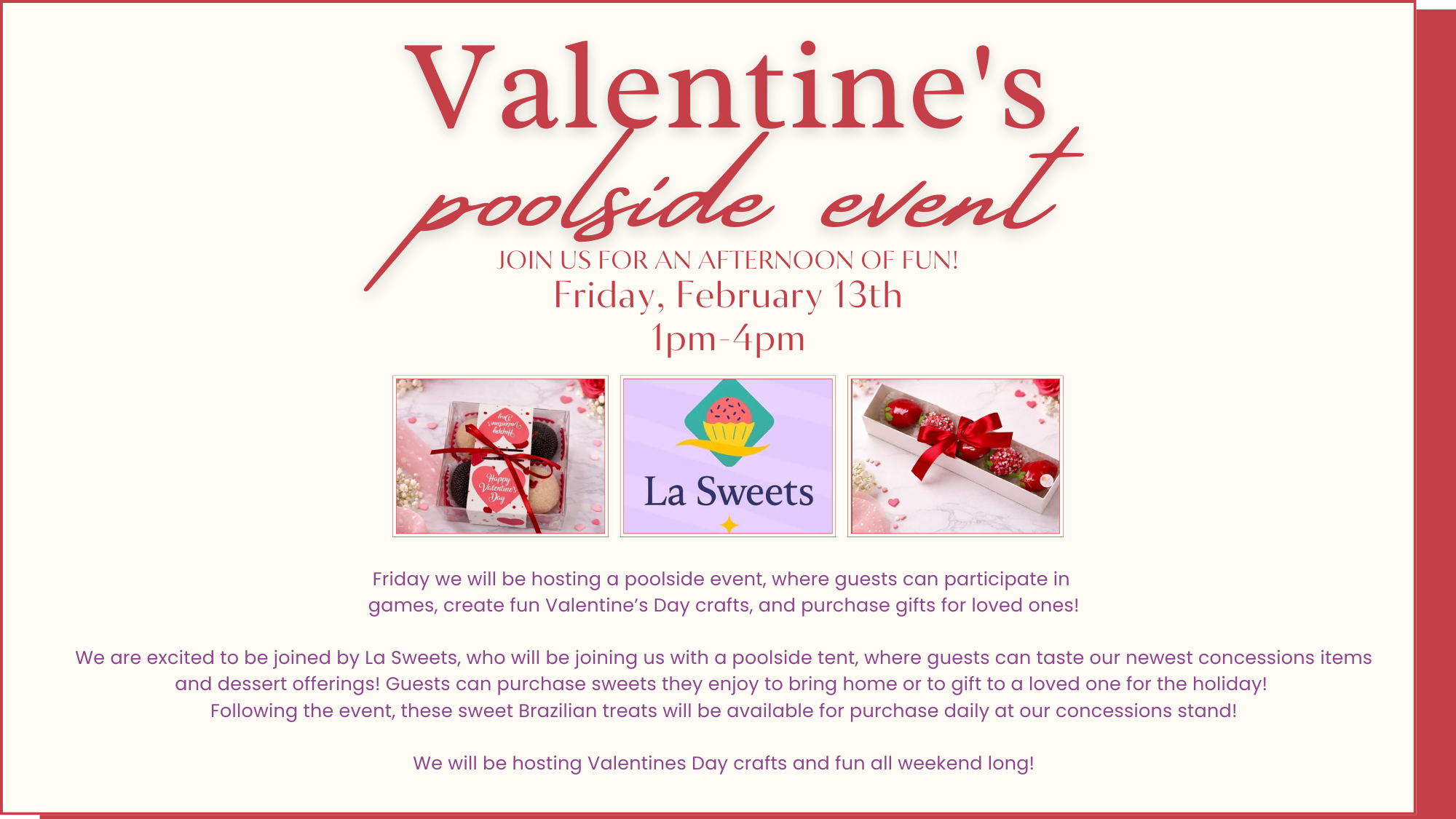 Clubhouse Poolside 2100 Tripoli Court, KISSIMMEE2026 Valentines Day Event Flyer Join us this Friday for a poolside event! Enjoy games, Valentine’s Day crafts, and even buy gifts for your loved ones. We're excited to have La Sweets at their tent by the pool, offering our latest snacks and desserts. Like what you try? Take some home or surprise someone special. […]